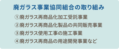 当社は、ガラスびんなどのリサイクルにより、環境への負担を減らし、資源の有効利用と可能性を開いていくため、経済産業省認可「廃ガラス事業協同組合」に参加し、廃ガラスの100%リサイクルを目指し、全国18社と共に活動をしております。